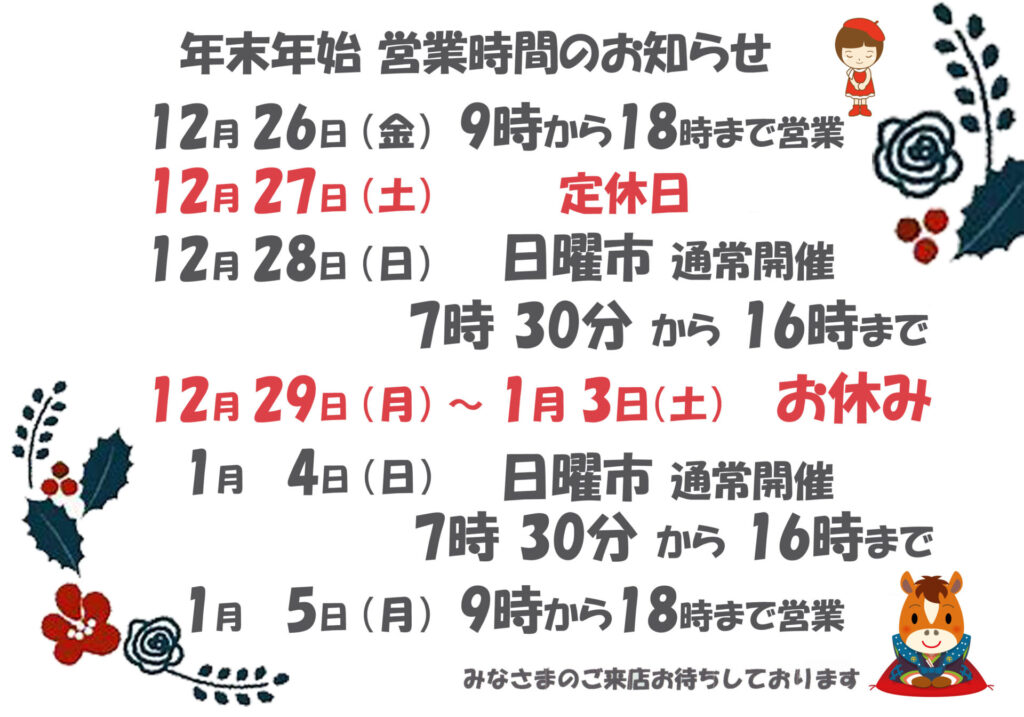 本日は 毎年恒例の 年末年始 営業時間のお知らせになります♪